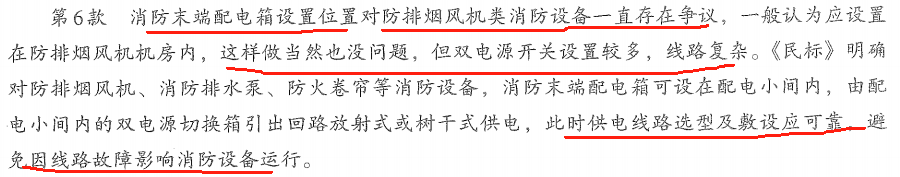 PS:此条的条文说明,将“防烟和排烟机房”与“消防控制室”“消防水泵房”并列写在一起,大部分人读起来都是“防烟和排烟机房”这个房间要单独做台最末级配电箱。