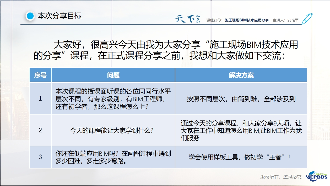 通过今天的分享课程,和大家分享9大项,让大家在工作中知道怎么用BIM,让BIM工作为我们服务